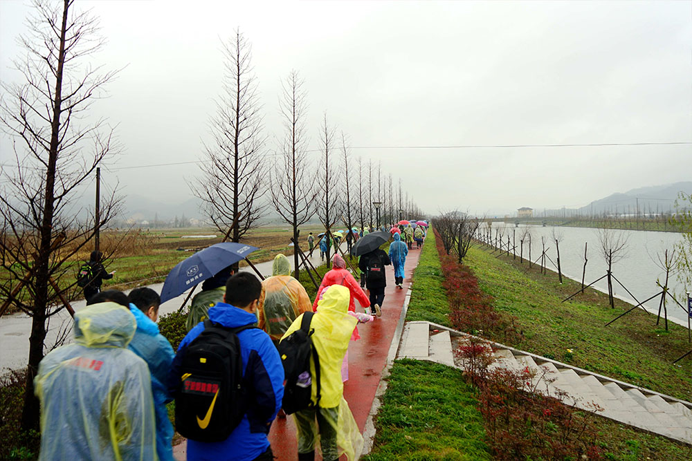 早上8點(diǎn)30分,徒步活動(dòng)在寒風(fēng)細(xì)雨中拉開了序幕。此次活動(dòng)設(shè)在上虞區(qū)濕地公園至四明湖水庫往返步道,全程約5.8公里,共設(shè)4個(gè)補(bǔ)給站。相比往年,今年的活動(dòng)在趣味性的基礎(chǔ)上增加了競賽性,采用活動(dòng)卡蓋章的方式記錄徒步行程,每位參賽選手可在4個(gè)補(bǔ)給站和終點(diǎn)站集齊5枚印章,即完成全程并可獲得相應(yīng)的紀(jì)念品一份。雖然天公不作美,但淅瀝的小雨和濕漉的步道并不影響大家的熱情,一路上大家有說有笑,相互鼓勵(lì),感受著沿途別樣的冬日風(fēng)景。