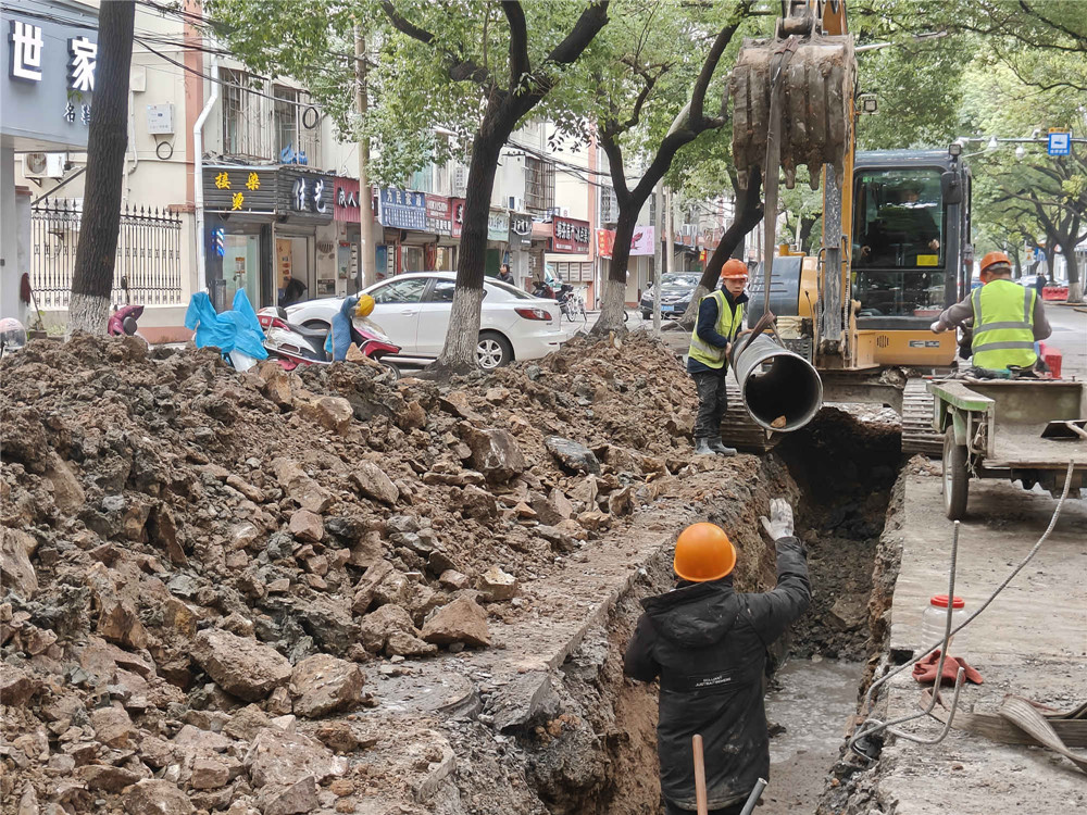 為改善體育場路周邊小區供水水質、水壓,市自來水公司組織實施體育場路(舜水北路—電力橋)DN300給水管改造工程,由于施工現場小區出入口較多,交通復雜,工期緊,經多次現場踏勘、討論施工方案后,最終決定采用道路開挖-管道敷設-碎石回填-土方外運的作業方式進行改造施工,與此同時與道路交通管理部門多次溝通后確定施工期間道路管制方案,盡最大努力減少對周邊居民的進出影響。在完成前期準備工作后,該工程于2月6日正式進場施工。