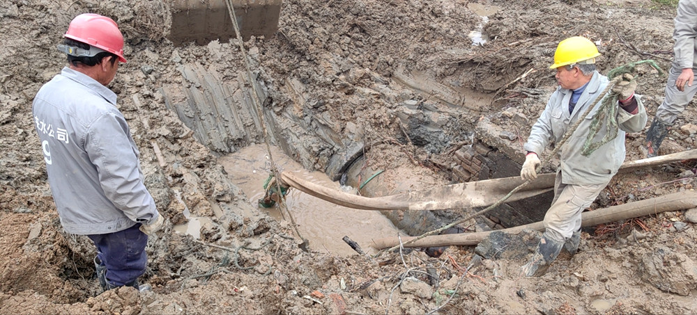根據現場查勘,確認是路面沉降原因導致水泥管承插處發生漏水,采用不停水方式安裝哈夫節包裹漏點,至16時修復,隨后開展管網沖洗至水質檢測合格,保障了七里浦水廠原水供應。