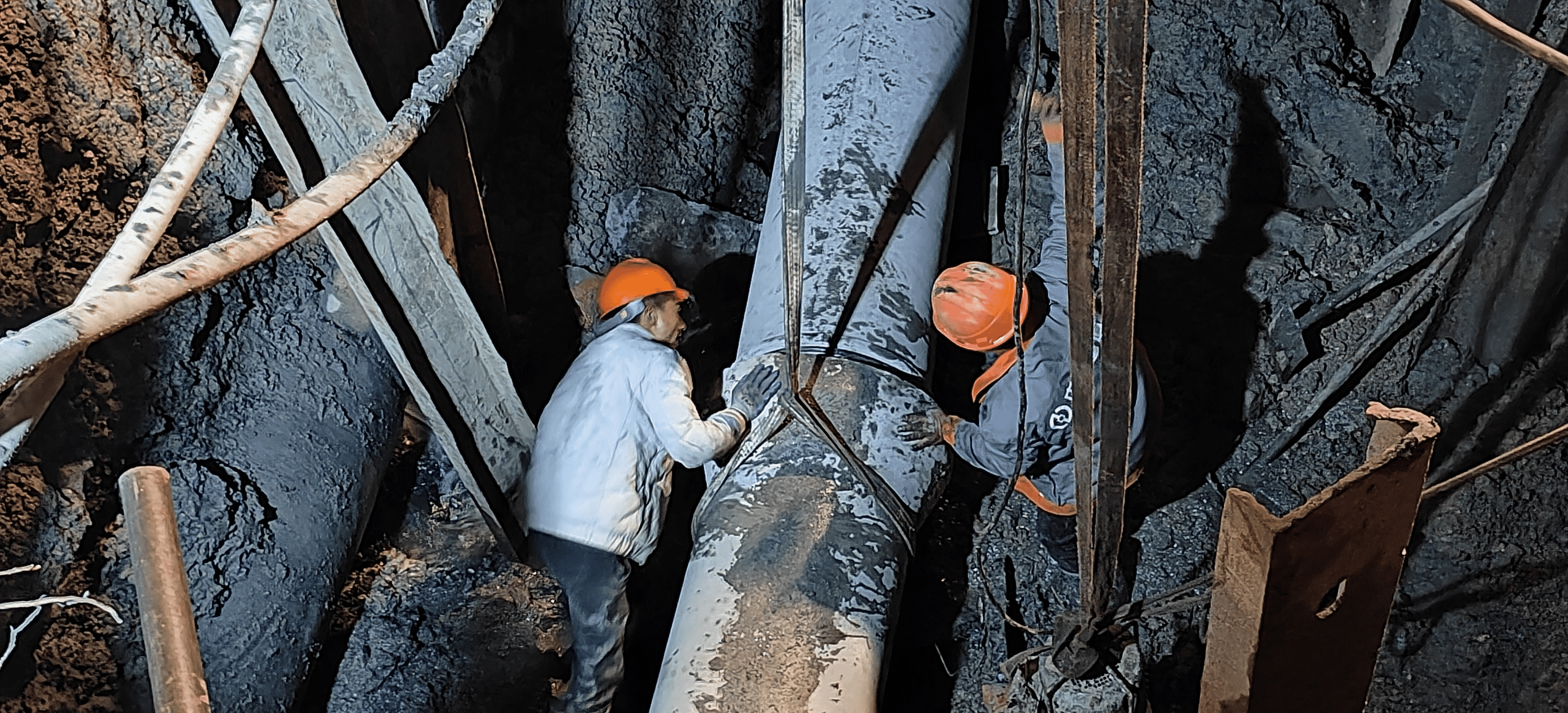 工作人員調(diào)集機器設(shè)備清理坍塌現(xiàn)場的碎石塊,并重新鋪設(shè)管段,用混凝土包管加固管道,保障污水收集輸送功能正常。