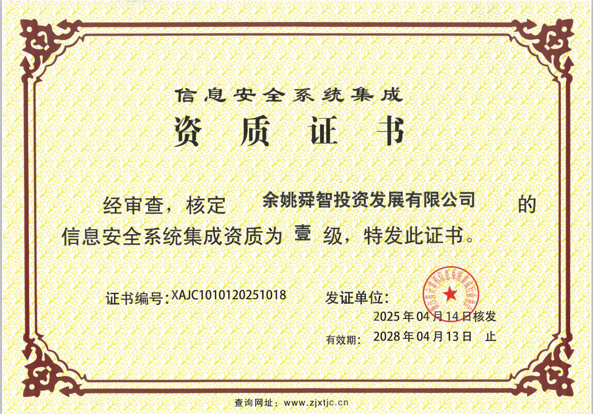 日前,余姚舜智投資發展有限公司順利獲得由浙江省計算機信息系統集成行業協會核發的信息安全系統集成資質證書(一級)。