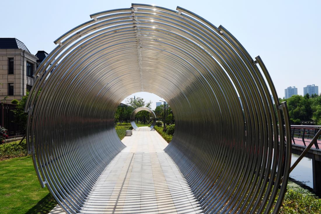 公園內的休憩廊架建筑風格現代簡約,簡潔的鋁板結合木條,虛實相間,通過材料的對比效果,使建筑散發清新、明快的氣息。通過材質對比,形成虛實相間的美妙構圖,呈現建筑的清新、明快。